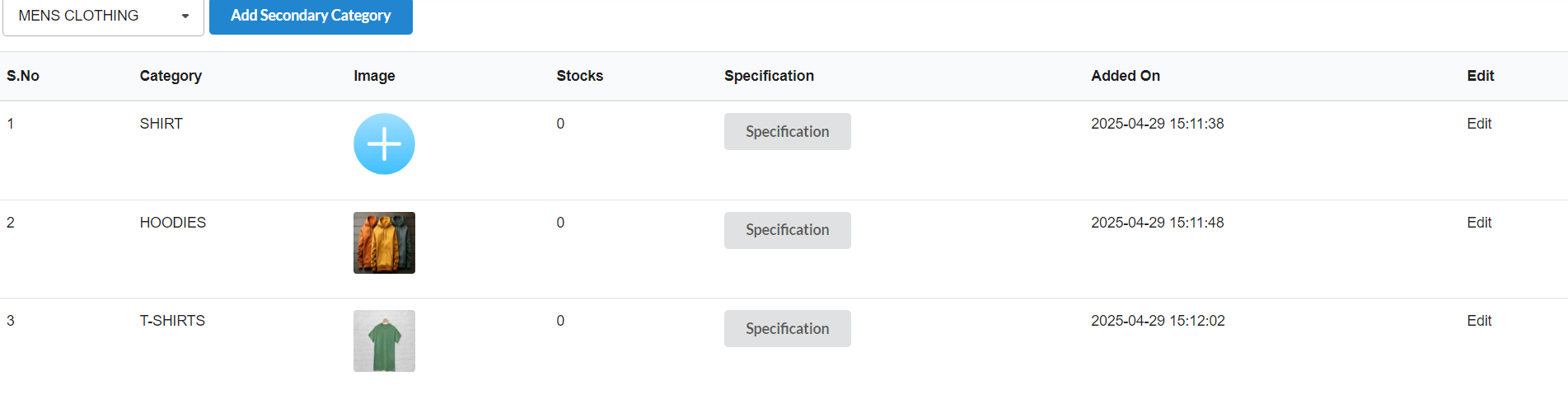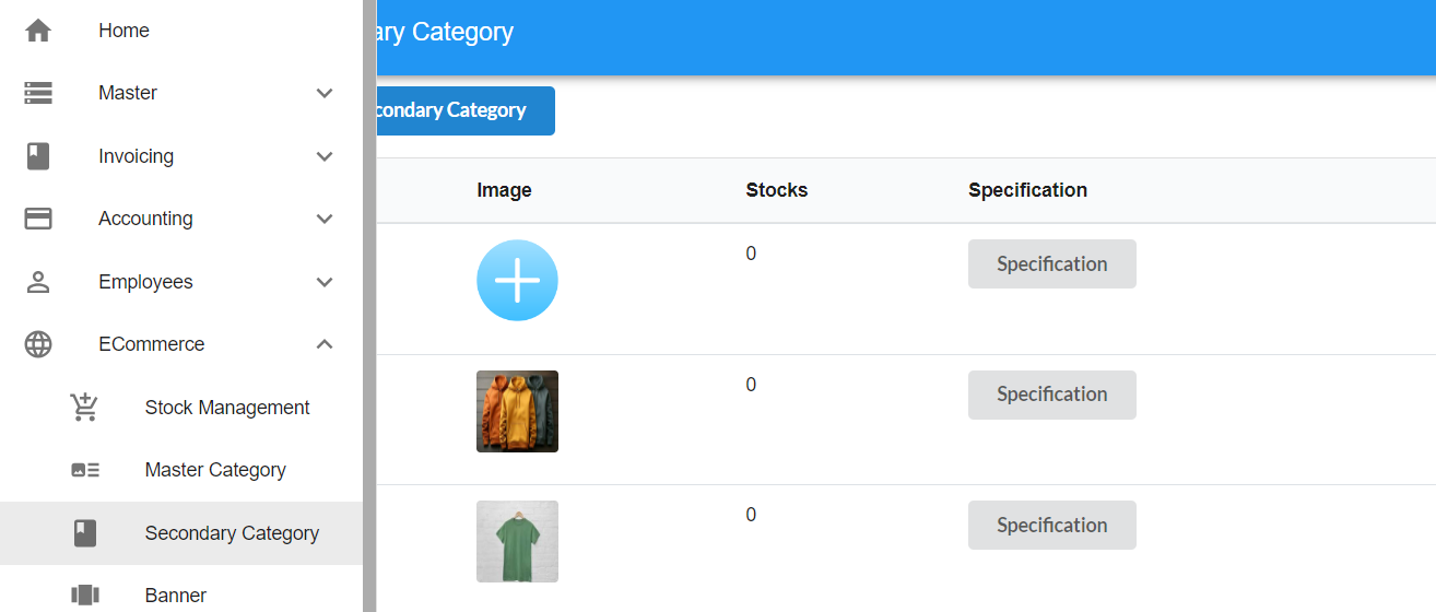 In the secondary category page, under the image column, if the image is already uploaded, the uploaded image will be displayed. On the other hand, if there is no image updated, you can see the ‘+’ button to update the new image.