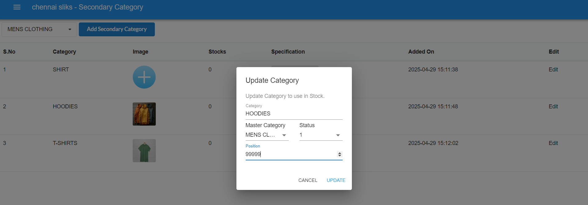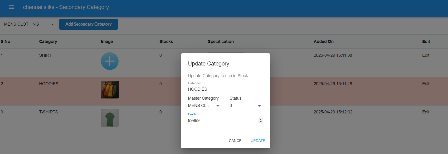 Click on the Edit button on the right side of the secondary category. A popup will appear where you can edit the category, master category, status, and position.